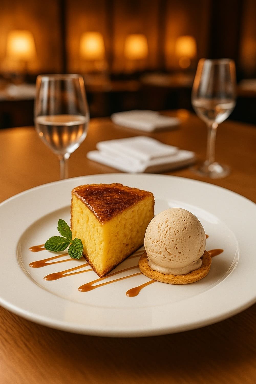 👨🍳 Versão Gourmet – “Bolo de Milho Brûlée com Sorvete Artesanal de Canela e Toque de Baunilha Bourbon”