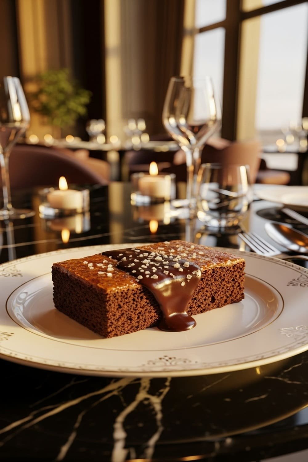 - Sirva quadrados generosos sobre uma ardósia preta, polvilhados com flor de sal e raspas finas de chocolate.