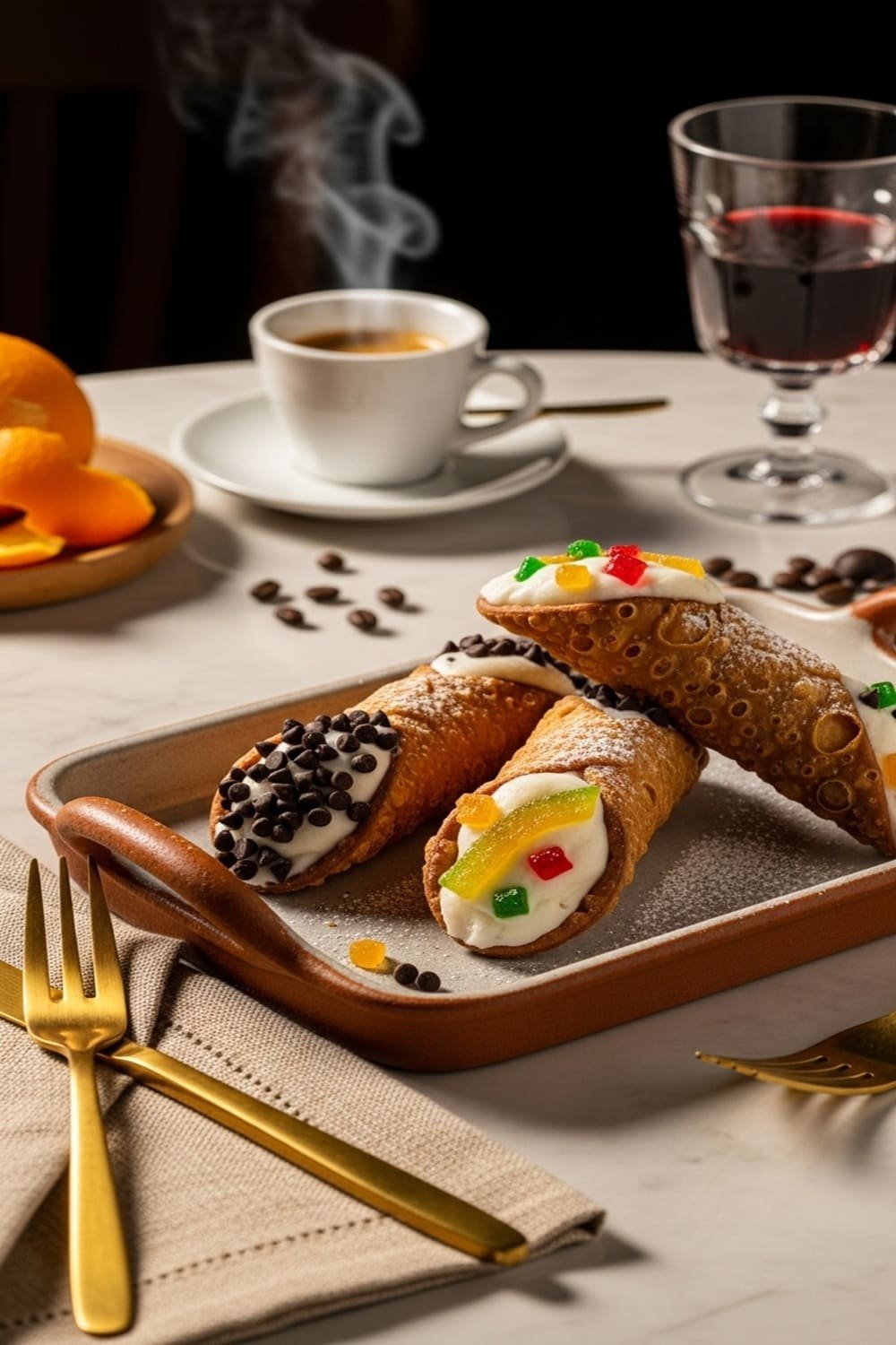 "O clássico doce da Sicília: casquinhas fritas crocantes feitas com Marsala e banha, recheadas com creme de ricota adoçado e decoradas com pistaches, frutas cristalizadas ou chocolate. Uma verdadeira joia da confeitaria italiana."