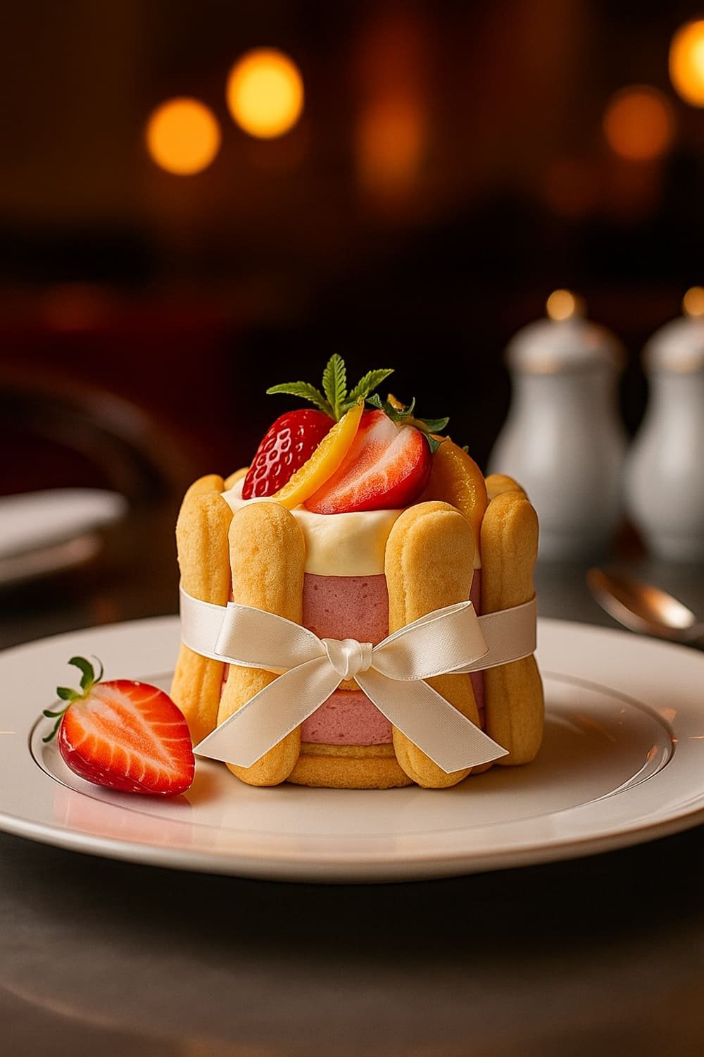 Taça de charlotte de morango e laranja com biscoitos champanhe visíveis ao redor — sobremesa sofisticada e fresca