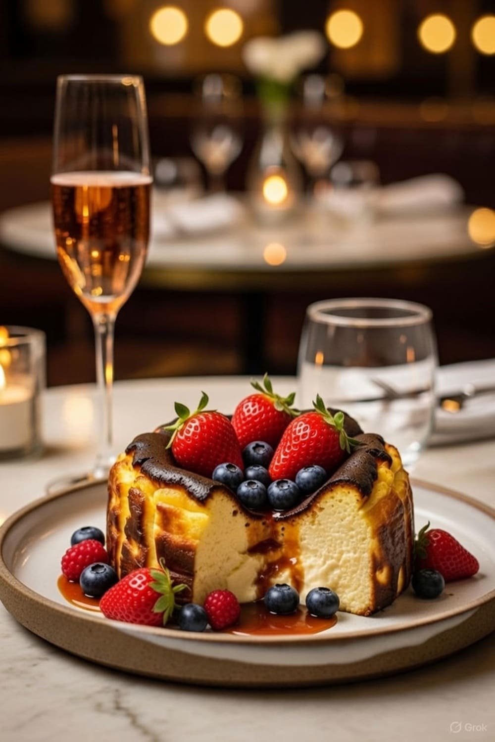 "Inspirado na confeitaria espanhola, este Cheesecake Basco Queimado entrega um interior sedoso, bordas intensamente caramelizadas e uma calda vibrante de frutas vermelhas que eleva a experiência a um nível digno de restaurante estrelado."