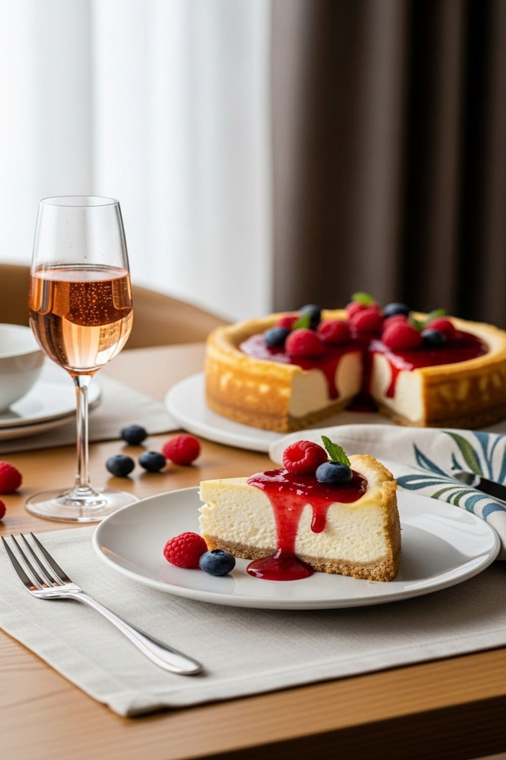 “Cremoso, delicado e com equilíbrio perfeito entre o doce e o ácido: um cheesecake de textura sedosa sobre base crocante de biscoitos amanteigados e cobertura vibrante de frutas vermelhas frescas. Elegância clássica em cada fatia.”