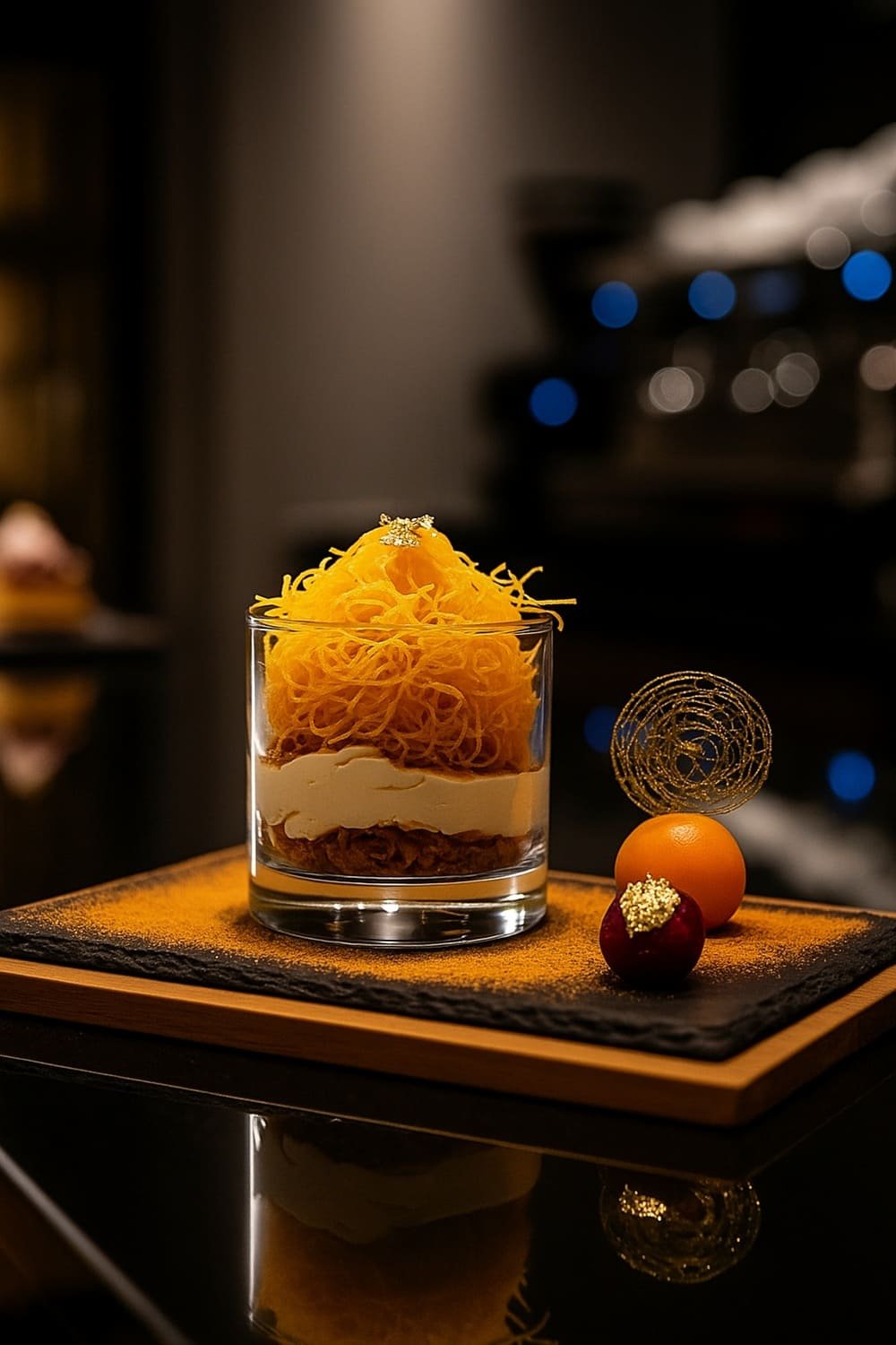 - Montagem moderna:Versão clássica envolta: disponha uma porção de fios de ovos, adicione o creme e feche como embrulho dourado.Versão desconstruída de bistrô: monte em taça com camadas alternadas de fios e creme, finalizando com amêndoas caramelizadas e folha de ouro comestível.