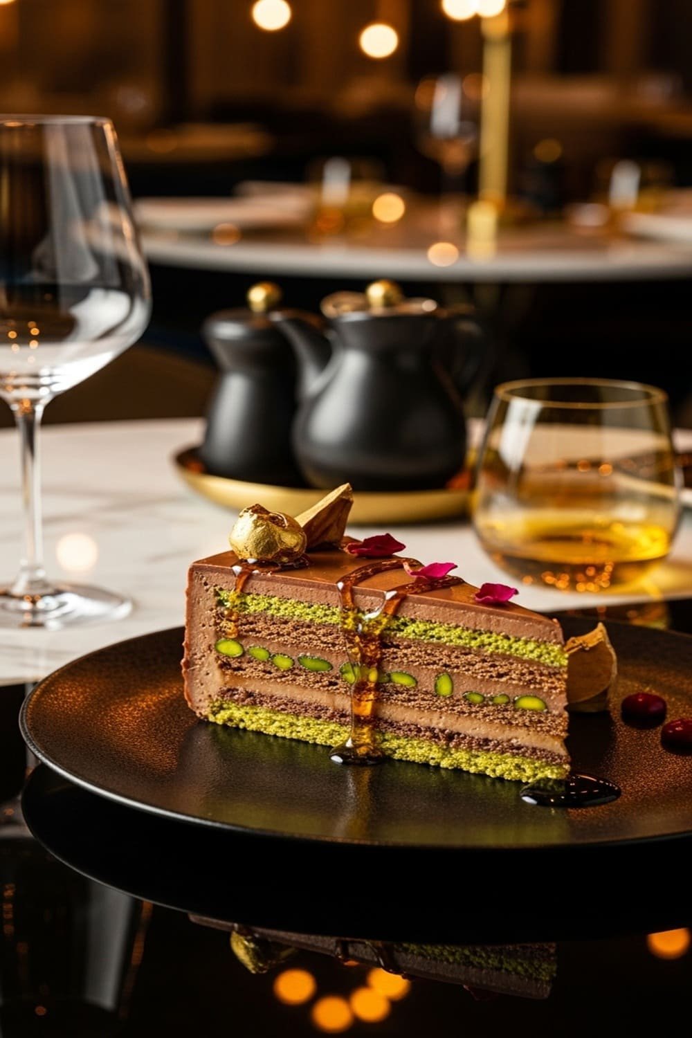 - Sirva em pratos de cerâmica preta, com traços de mel e pistaches dourados.