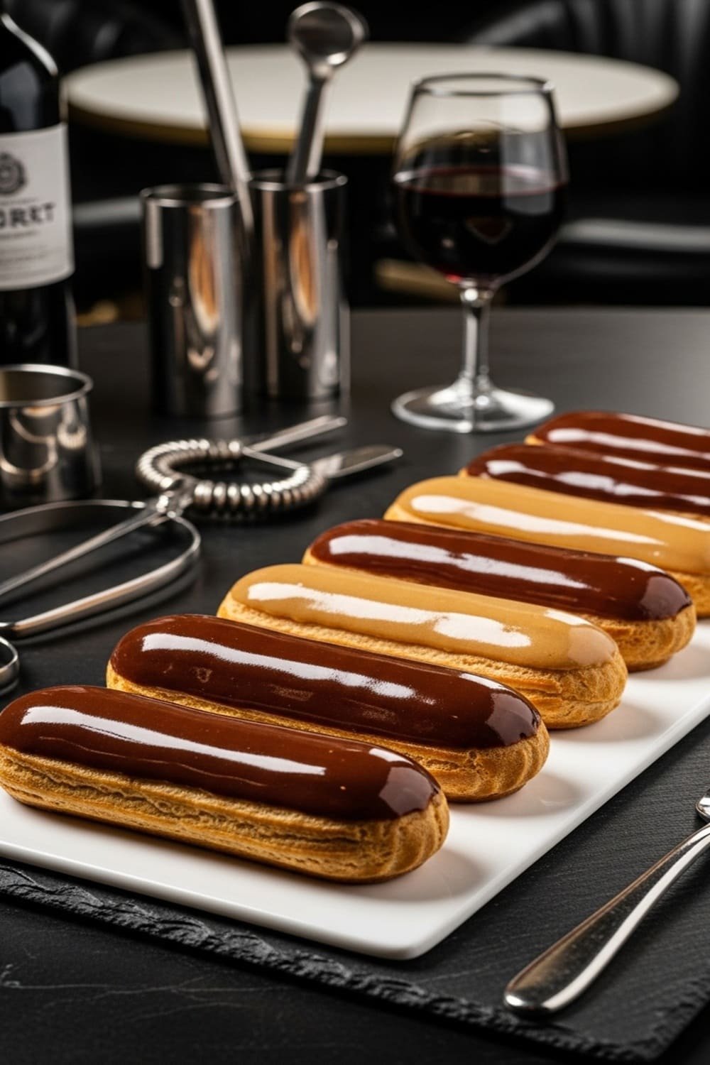 "Um clássico francês atemporal, os Éclairs de Chocolate com Glaçagem Brilhante unem leveza e sofisticação. A massa choux crocante por fora e recheada com um crème pâtissière de chocolate belga e finalizada com uma glaçagem espelhada que reflete elegância e técnica. Perfeitos para um bistrô de alto padrão, unem textura, brilho e equilíbrio de sabor."