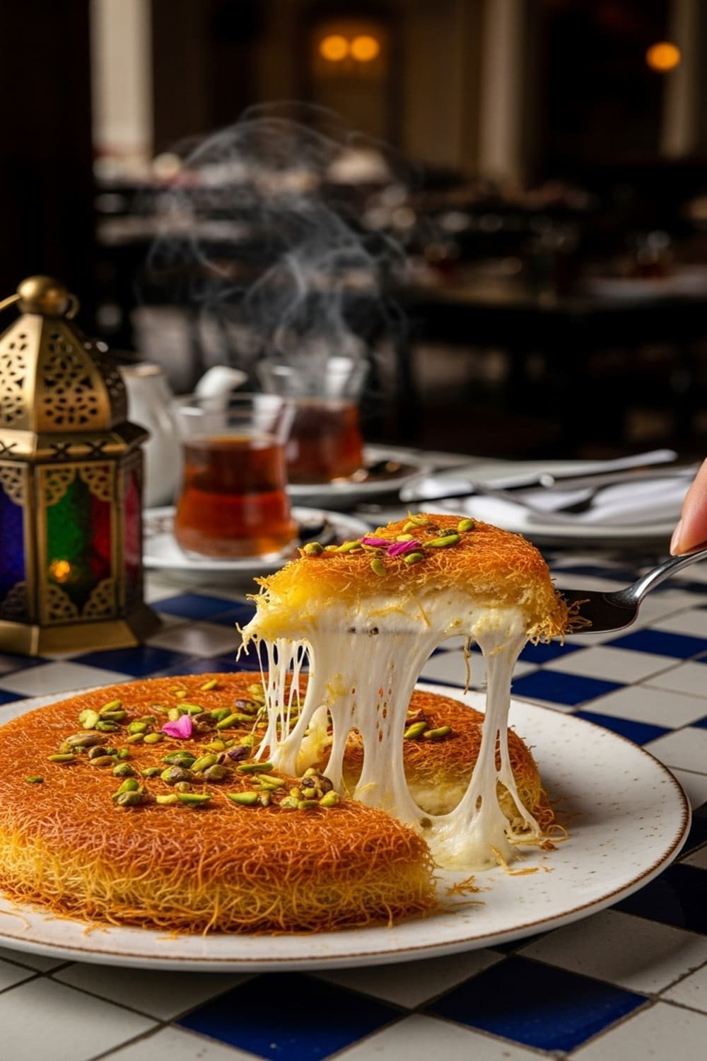 “O Knafeh Nabulsiyeh é uma das sobremesas mais icônicas do Oriente Médio: uma fusão mágica de texturas e aromas. A camada crocante de massa cabelo de anjo envolve um recheio de queijo quente e elástico, finalizado com uma calda doce e floral que perfuma o ar. É uma experiência sensorial completa — doce, salgada e delicadamente aromática.”