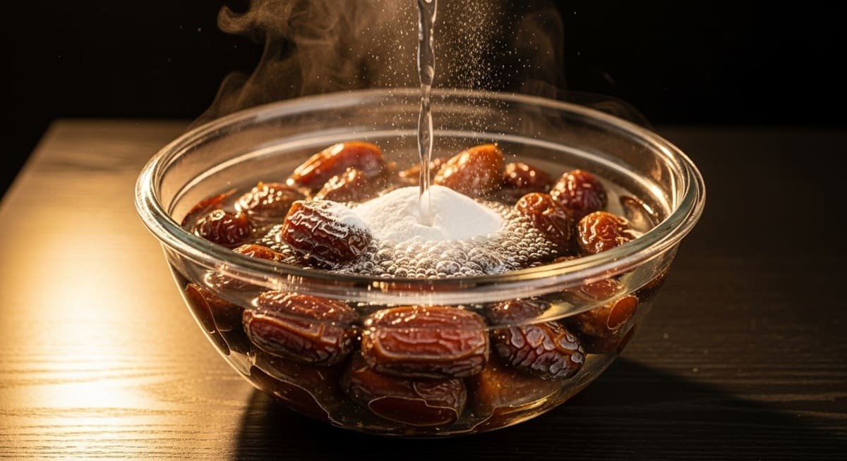 - Em uma tigela, cubra as tâmaras picadas com água fervente e bicarbonato; deixe amolecer por 5-10 minutos. Amasse com garfo até pasta rústica.