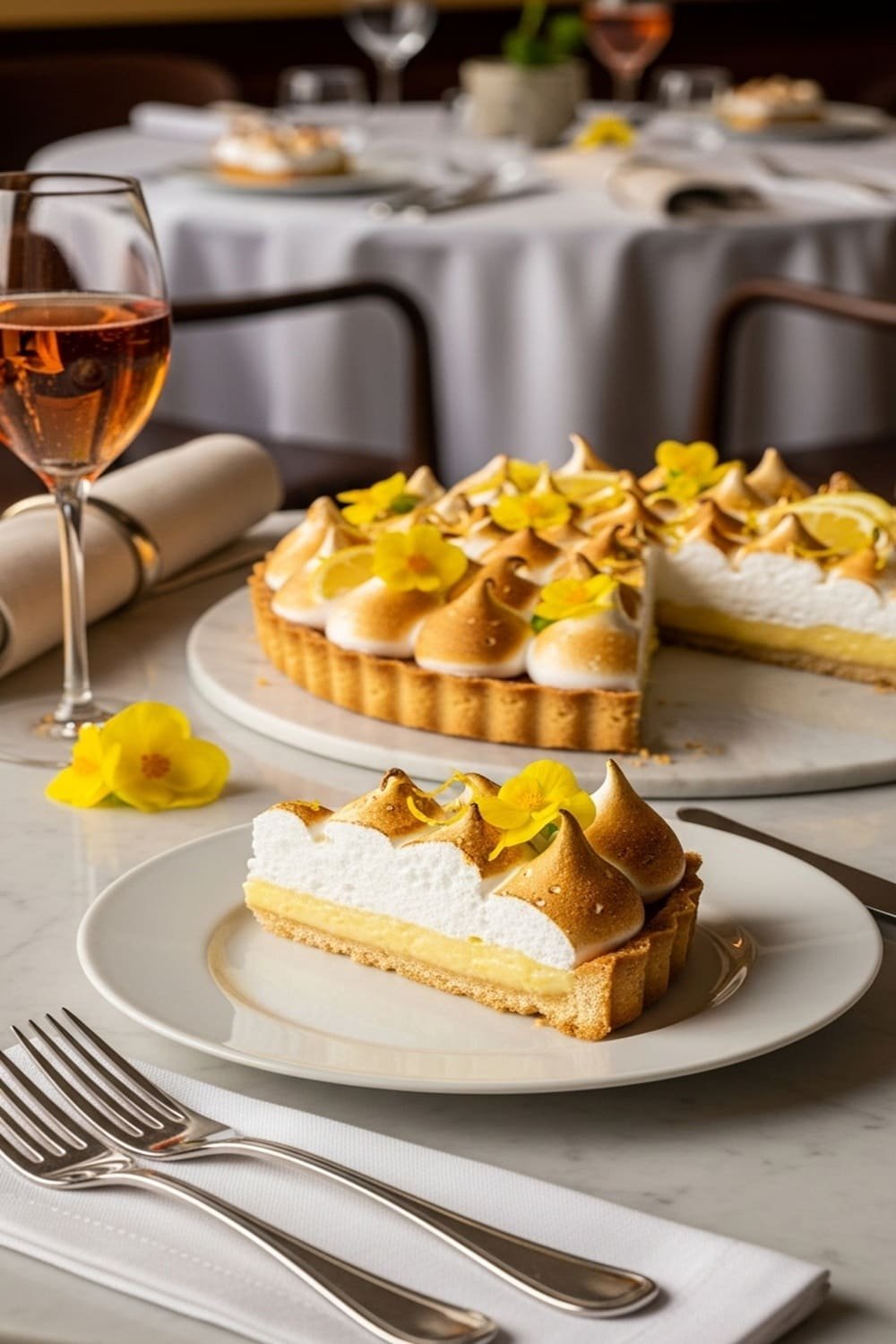 - Sirva em prato branco minimalista, com merengue em picos dourados e raspas finas de limão.