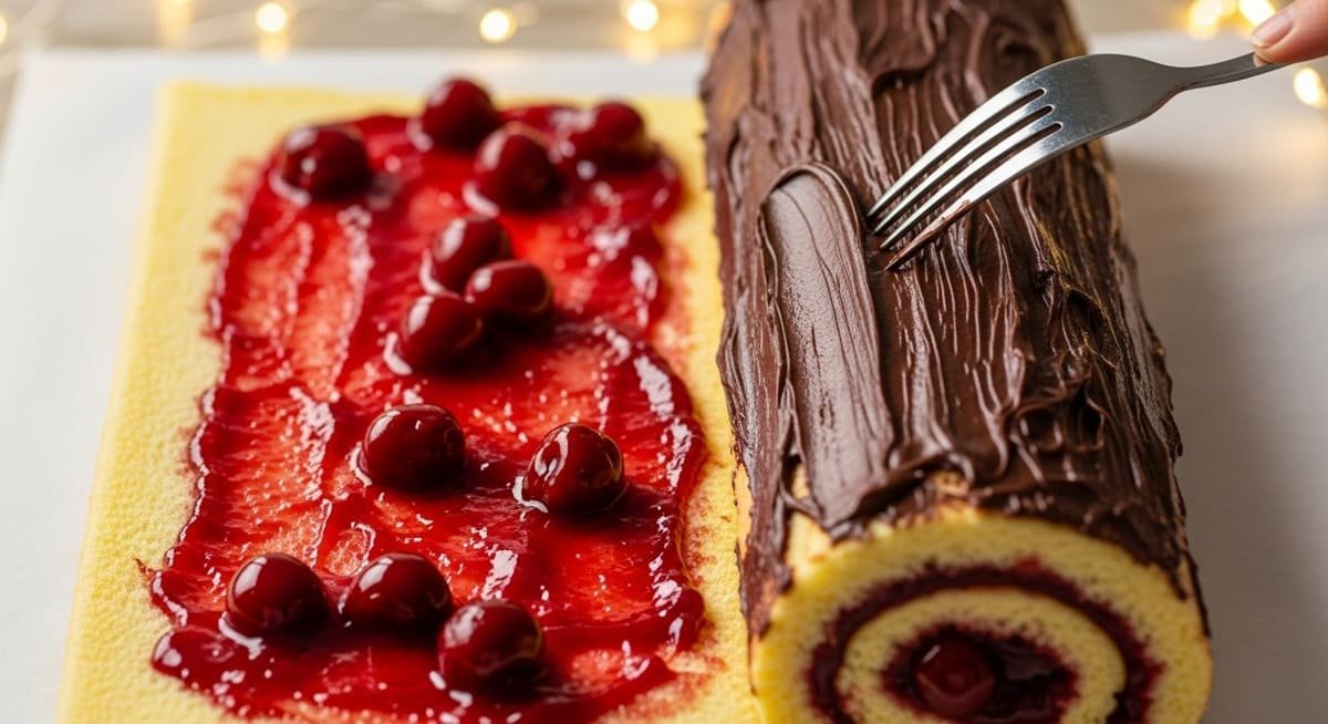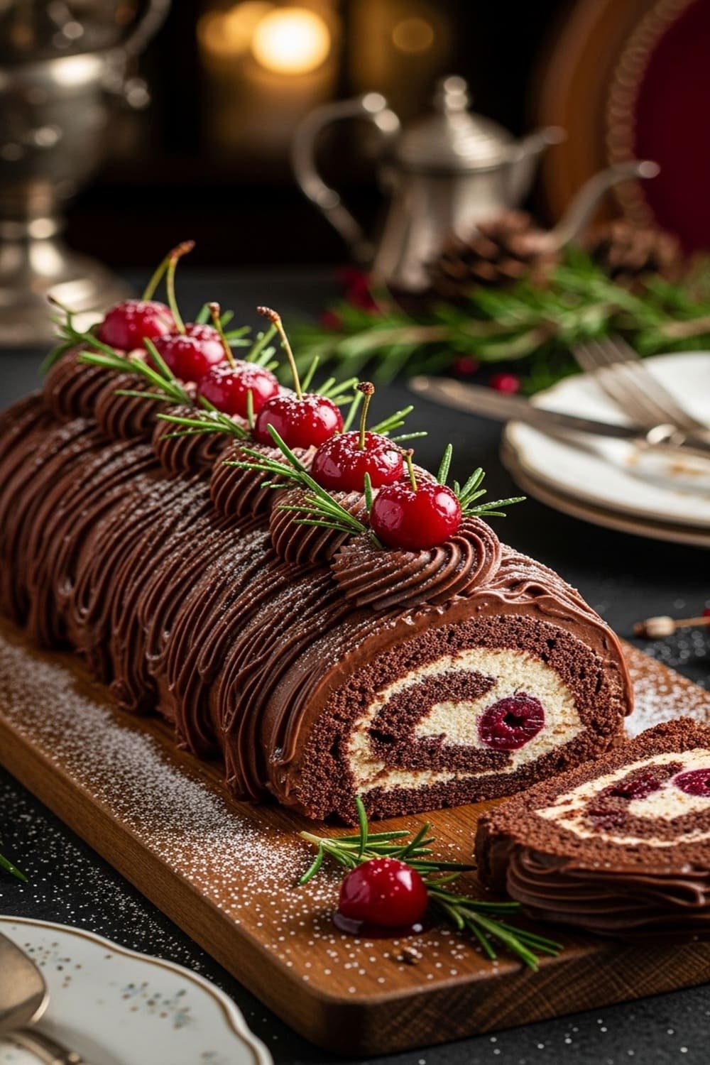 Tronco de Natal (Bûche de Noël) de Chocolate e Cereja — Sobremesa Gourmet de Natal